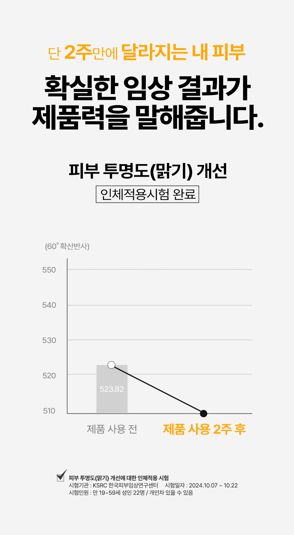 - Skin Transparency (Clarity) Improvemen: 105.04% (Clinical Result)
